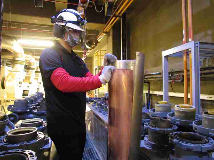 万利将废弃物转化成有效的工业或民生原物料,,,图为废铜液淬炼后再制成纯度极高的铜管
