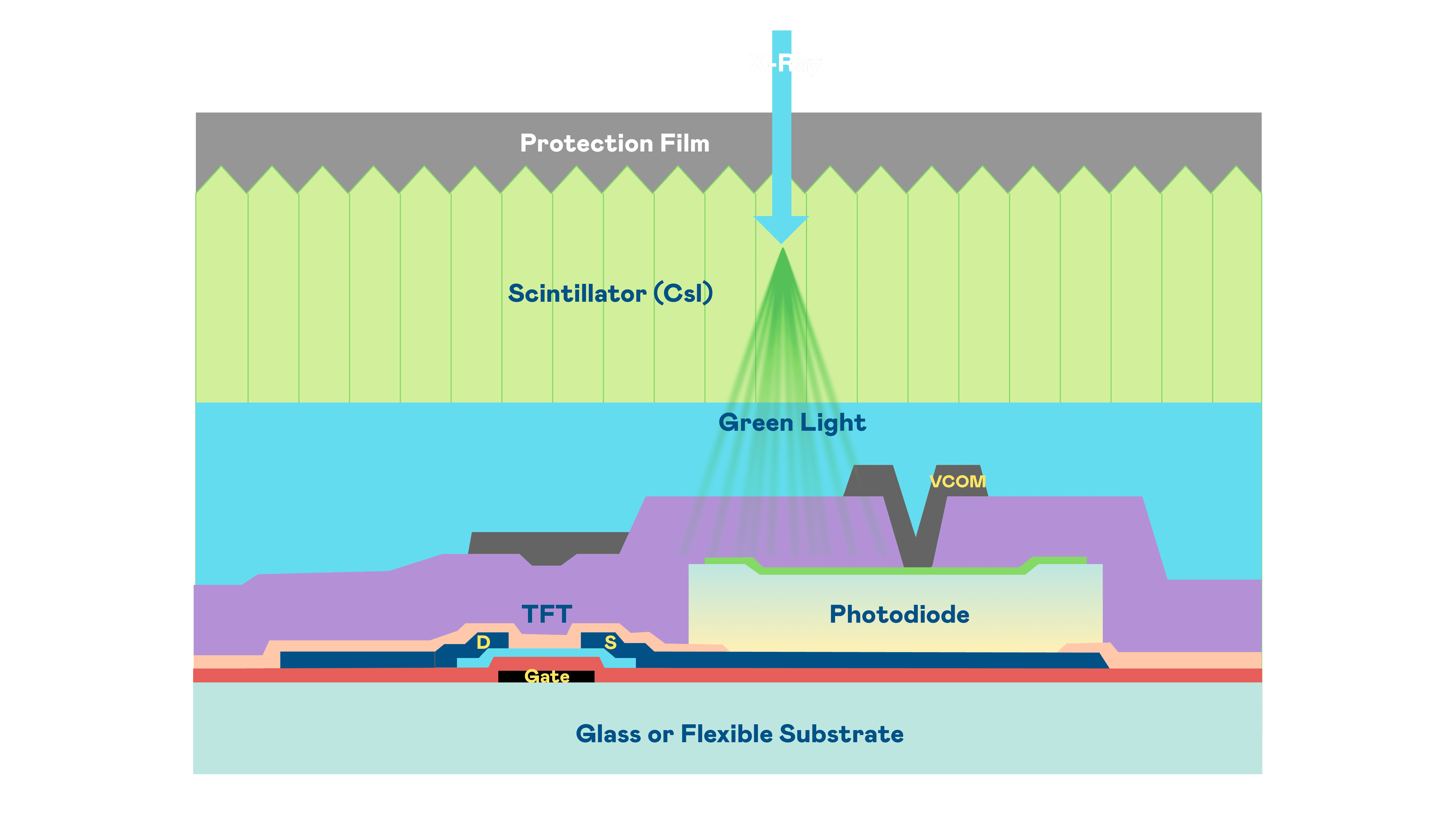 万利的X光影像感测阵列使用薄膜电晶体 (TFT) 作为每个像素的读取开关,,搭配光电二极体(Photodiode)的光电转换元件,,,,用以感测X光影像讯号。。。。